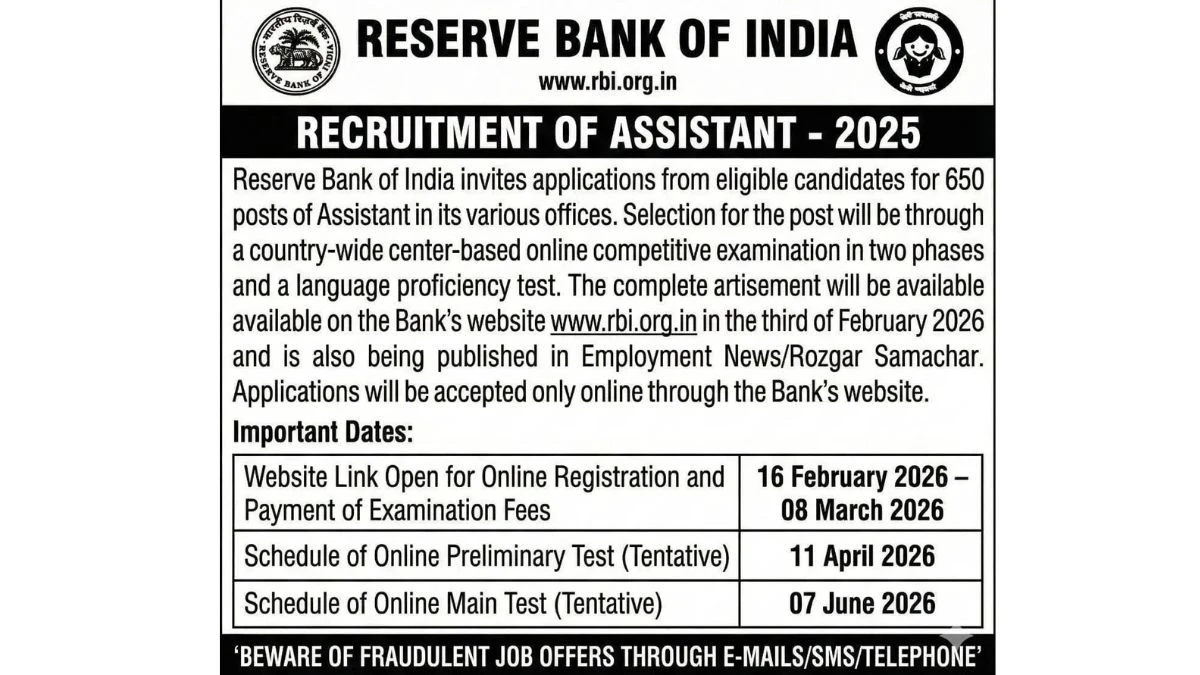 The Reserve Bank of India (RBI) has released a notification for the Recruitment of 650 Assistant Posts in 2026. Candidates who have completed a Bachelor’s Degree in any discipline from a recognized university are eligible to apply. The online application process will begin on 16 February 2026 and will close on 10 March 2026. Interested and eligible candidates can submit their applications online through the official website of the Reserve Bank of India at rbi.org.in before the last date.